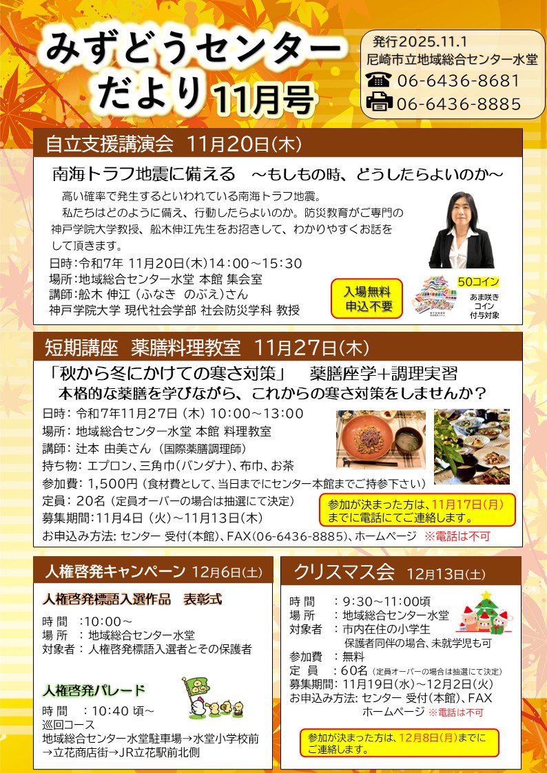 みずどうセンターだより11月号掲載しました 2025.11.07 センターでは、11月号の催しとして、 ・11月20日(木)自立支援講演会南海トラフ地震に備える ・11月27日(木)短期講座薬膳料理教室 詳しくは、センターだより11月号をご覧ください。 【画像をクリックしてPDF版をご覧ください】