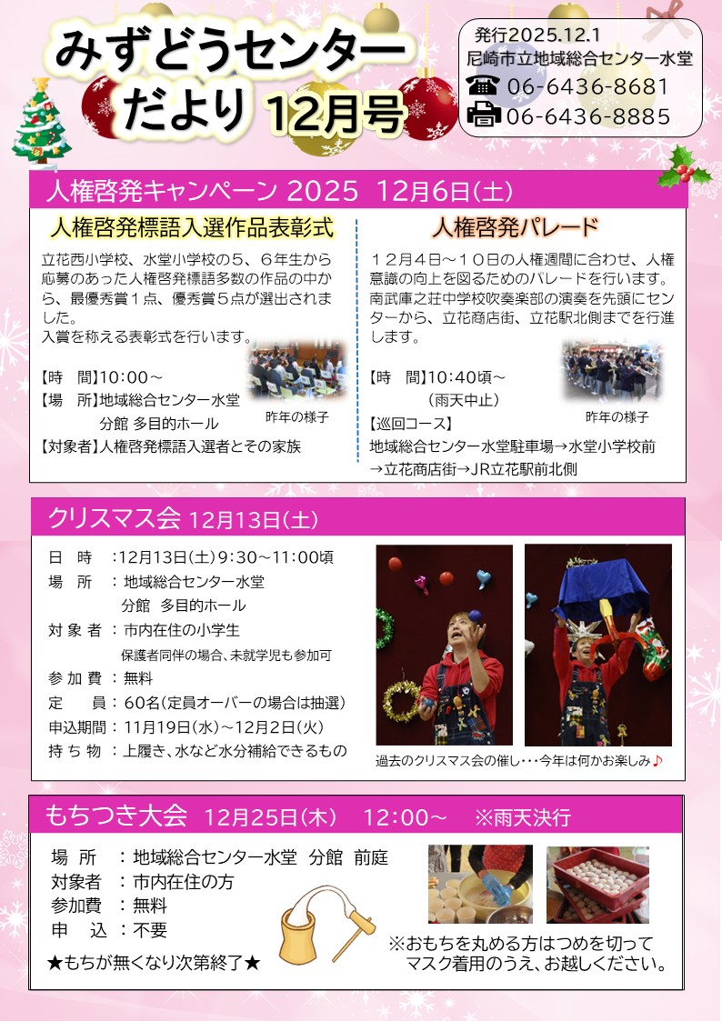 みずどうセンターだより12月号掲載しました 2025.11.28 センターでは、12月号の催しとして、 ・12月6日(土)人権啓発キャンペーン ・12月13日(土)クリスマス会 ・12月25日(木)もちつき大会 詳しくは、センターだより12月号をご覧ください。 【画像をクリックしてPDF版をご覧ください】