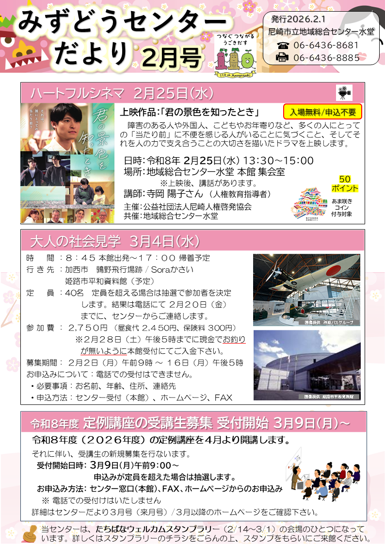 みずどうセンターだより2月号掲載しました 2026.01.292026.01.30 センターでは、2月の催しとして、 ・2月25日(水)ハートシネマ 上映作品「君の景色を知ったとき」 ・3月 4日(水)大人社会見学 ・3月 9日(月)令和8年度定例講座受講生募集受付開始 ・3月19日(木)交通安全教室 ・3月26日(木)短期講座「薬膳料理教室」 詳しくは、センターだより2月をご覧ください。 【画像をクリックしてPDF版をご覧ください】