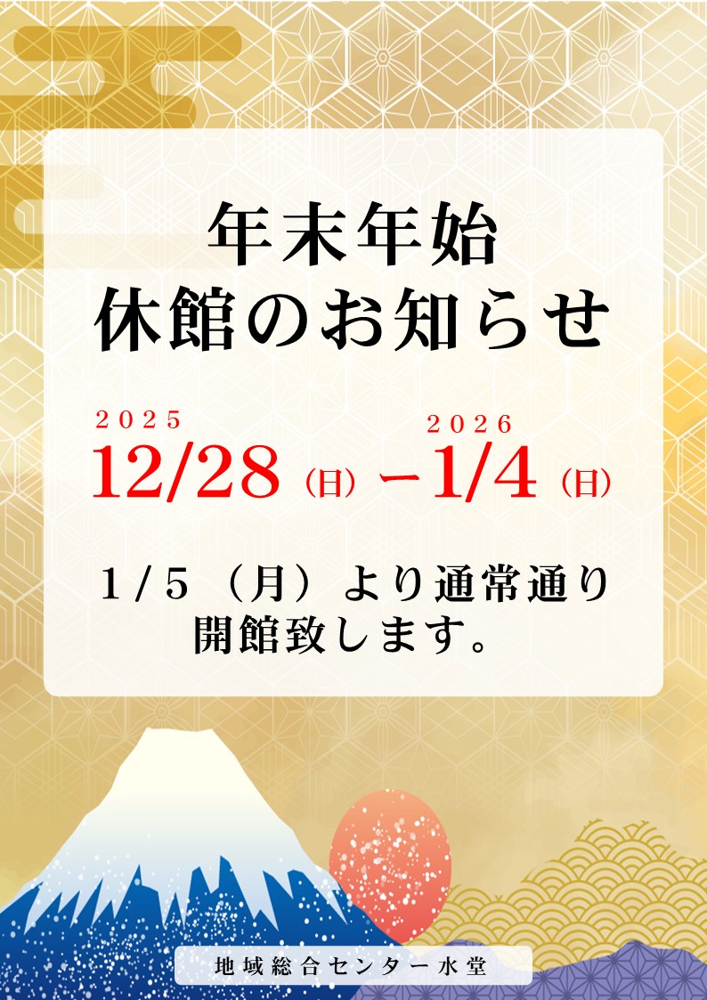 12/28(日)~ 1/4(日)までお休みさせていただきます。