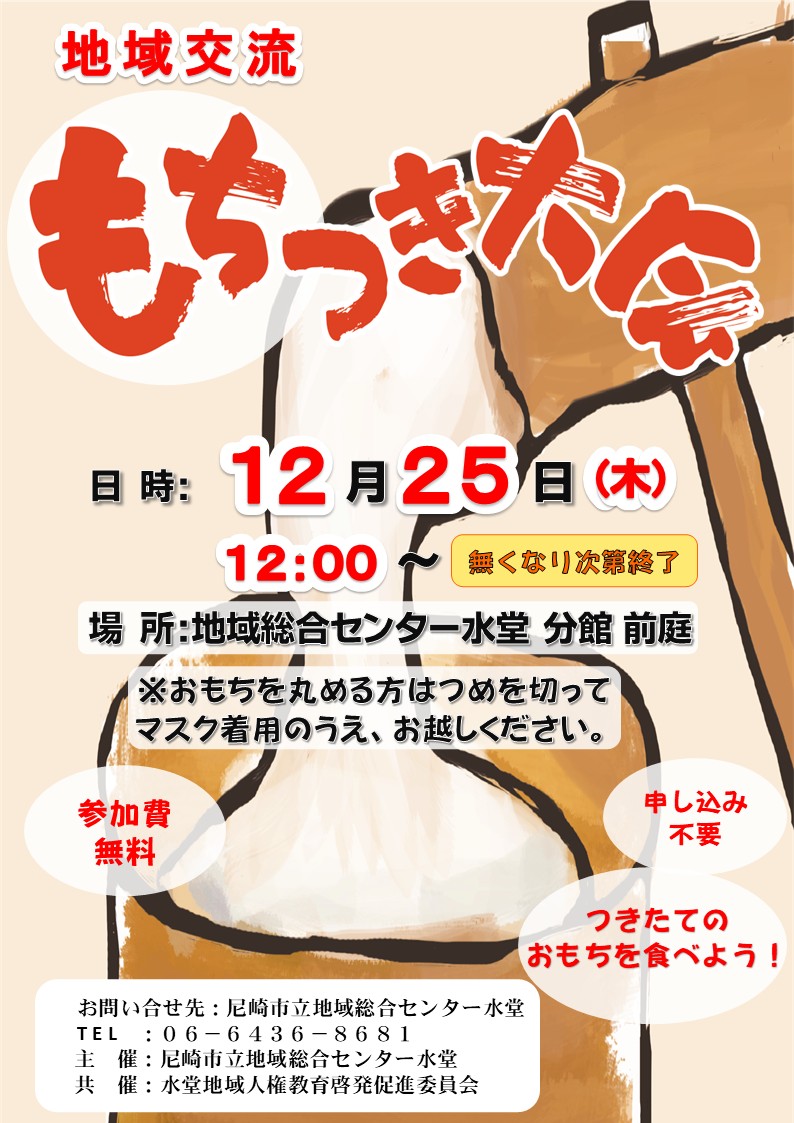 年末恒例「もちつき大会」開催のお知らせ 2025.12.17 地域の交流促進を目的として、年末恒例のもちつき大会を開催いたします。 つきたてのおもちを味わいながら、地域の皆さまが一緒に楽しんで交流できるイベントです。 ご家族やご友人とお誘い合わせのうえ、ぜひご参加ください。 【画像をクリックしてPDF版をご覧ください】