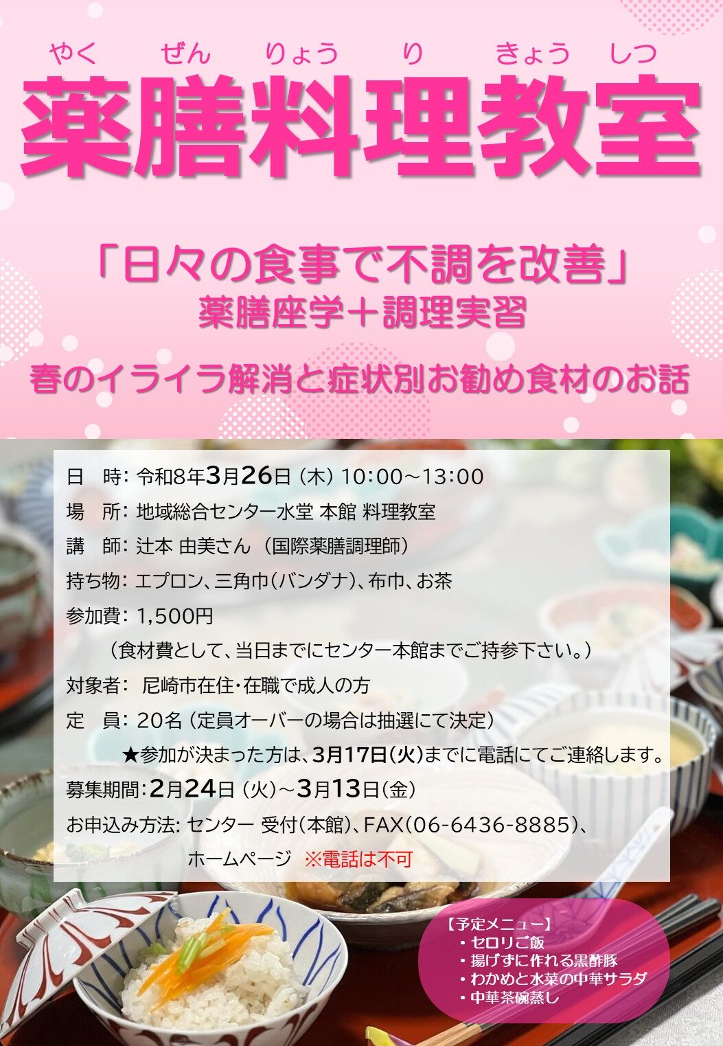 3月26日(木)薬膳料理教室 ただいま参加者募集中!